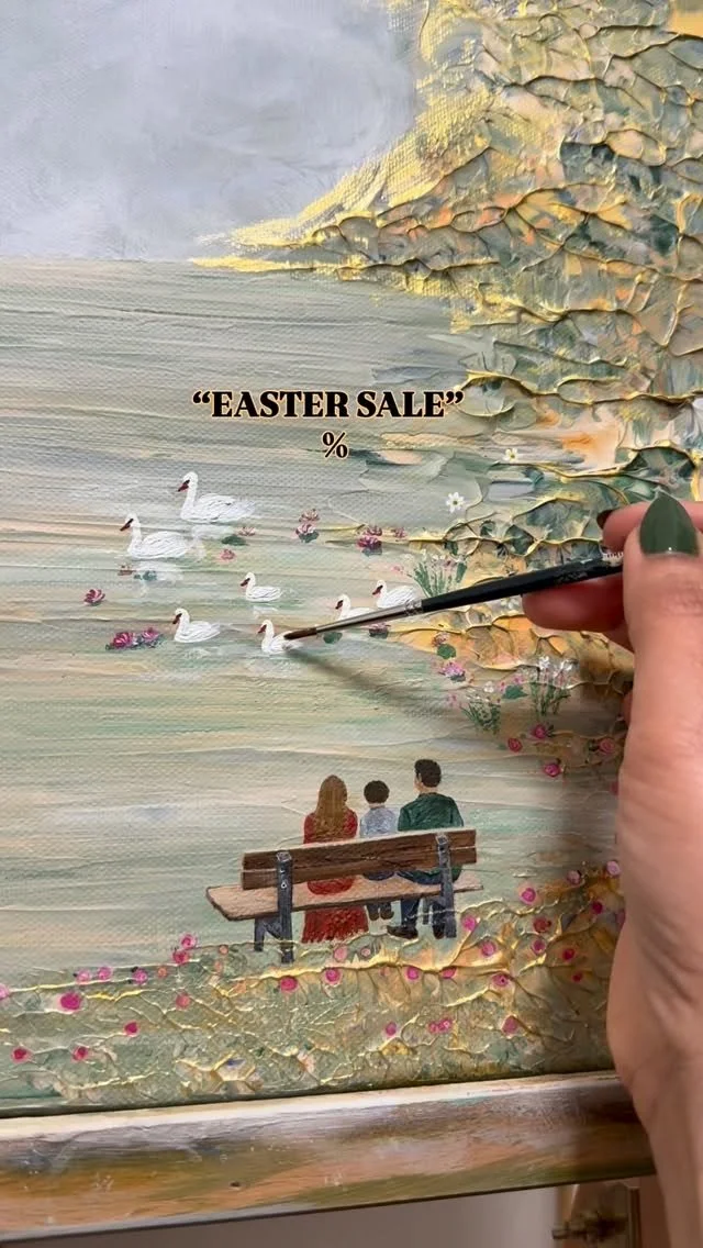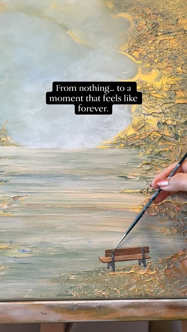 Tauchen Sie ein in die ruhige Ausstrahlung dieses halbabstrakten Landschaftsgemäldes, das durch seine harmonische Komposition und sanfte Farbpalette begeistert. „Endless Blessings“ zeigt eine friedliche Uferszene, umgeben von warmen Goldtönen und feinen floralen Details, die Tiefe und Gelassenheit vermitteln.